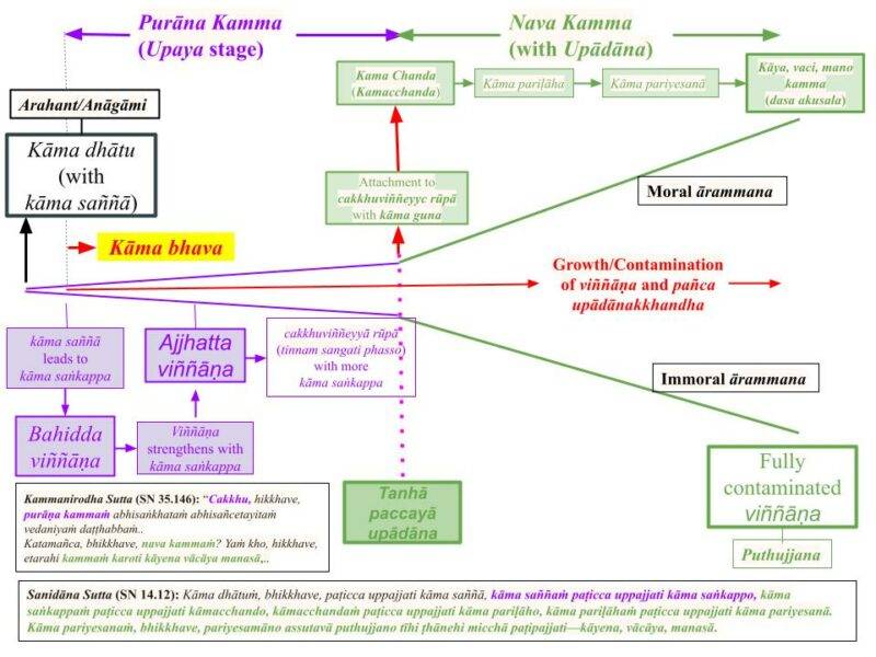 - Aber die zweite Stufe, nava kamma, wird nur dann eingeleitet, wenn das Objekt (ārammaṇa) stark genug ist, um die bewusste Anhaftung (taṇhā) an dieses „vom Geist geschaffene Rupa“ auszulösen. Wenn das geschieht, dann wird der „Standard Paṭicca Samuppāda“ Prozess zum taṇhā paccayā upādāna übergehen, was zu einer „schnellen und starken Ausdehnung von Viññāna„ führt.